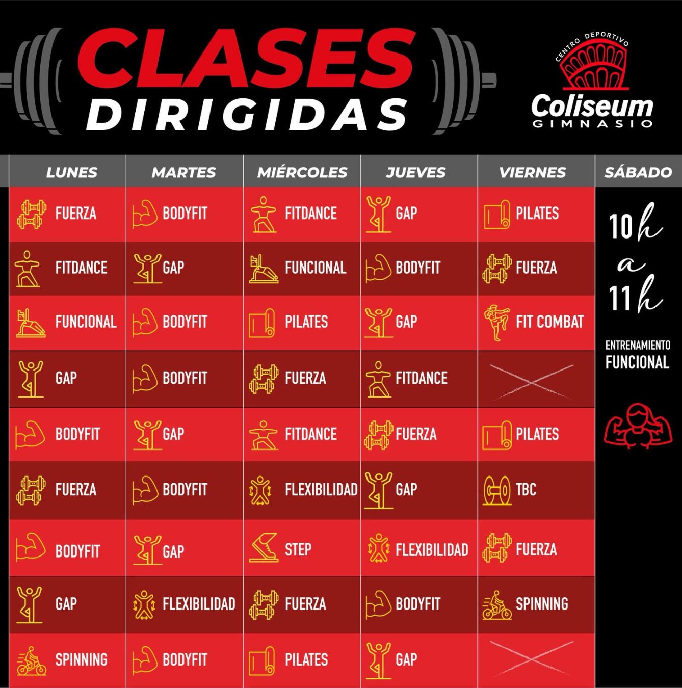 Un distintivo de Coliseum es la alta calidad e intensidad de sus clases, todas ellas impartidas por monitores titulados y cualificados. Destacan zumba, bodyfit, G.A.P, Step, Pilates, T.B.C y spinning. Puedes asistir a todas sus clases de 9.30h hasta la última clase que es a las 21h.